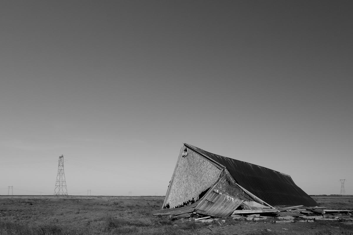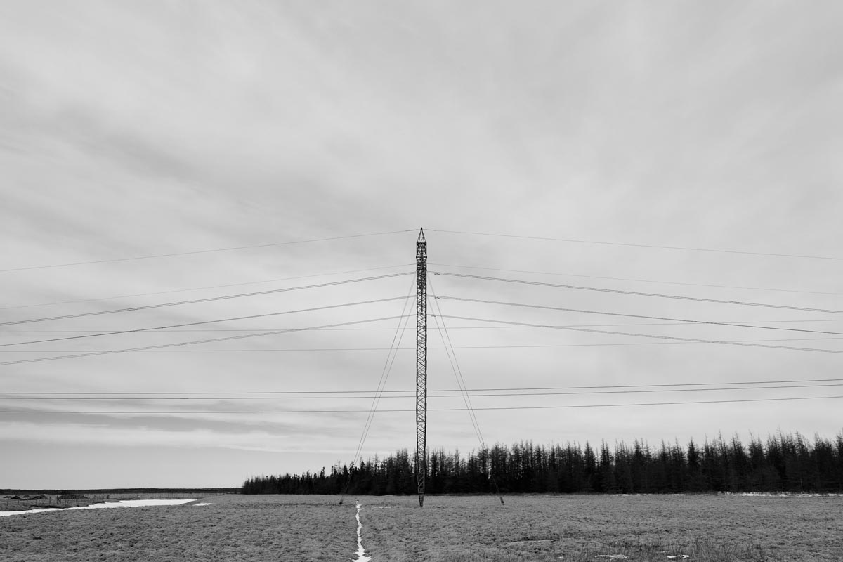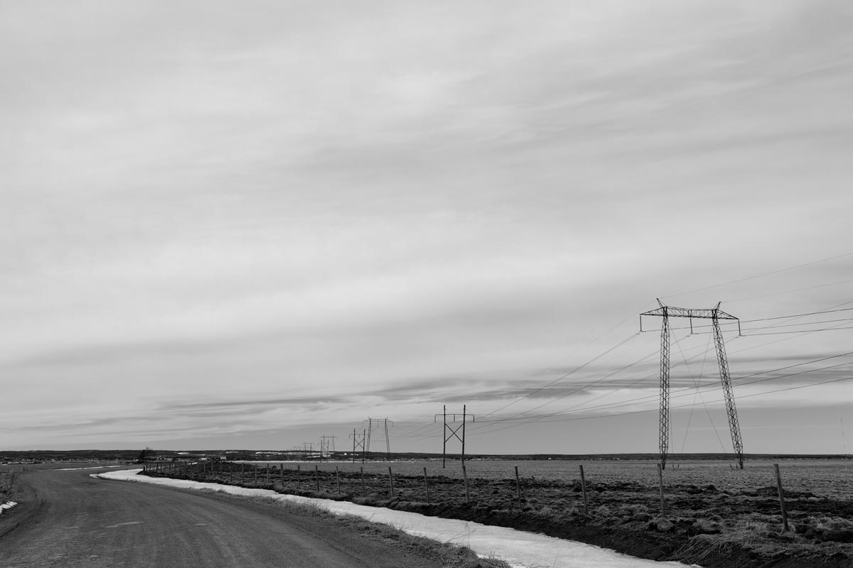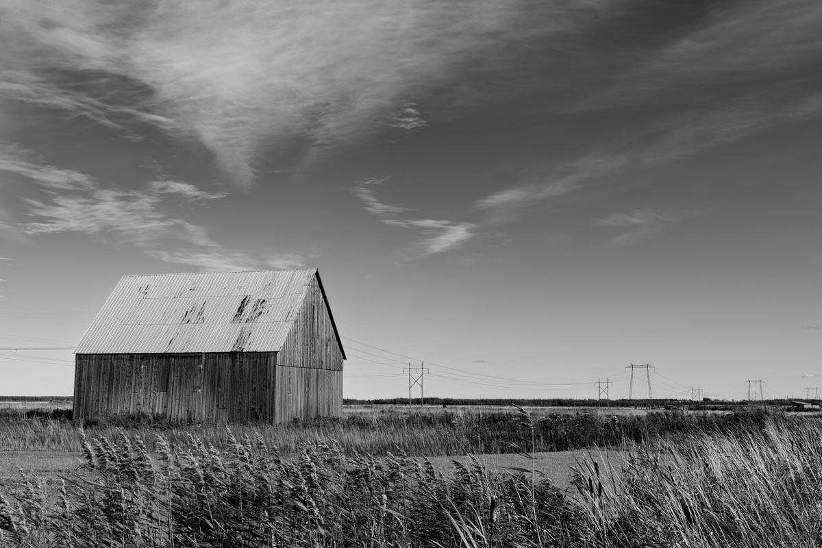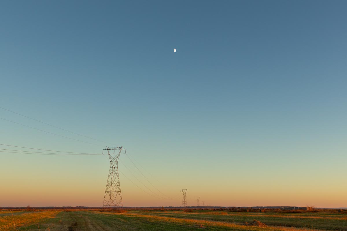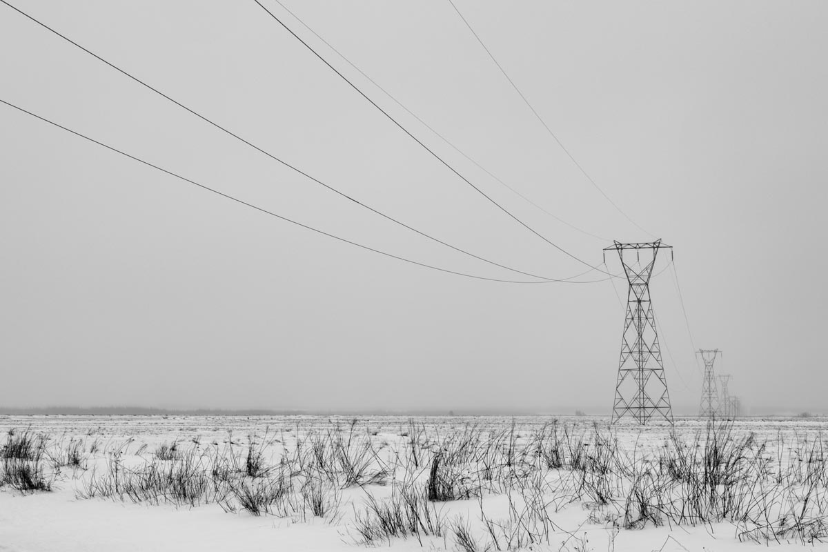 Major electrical transmission lines also cut through the Tantramar Marsh, and the large steel towers and high-voltage lines loom over the fields. At first I was annoyed by their presence, and would often try to frame images to exclude the towers and make it as easy as possible to remove the transmission lines in Photoshop. Over the years, though, I came to recognize them as an integral part of the landscape and now willingly incorporate them into the images, either as a compositional element or as the main subject. If they are ever-present to the eye, they can be ever-present in the photograph.