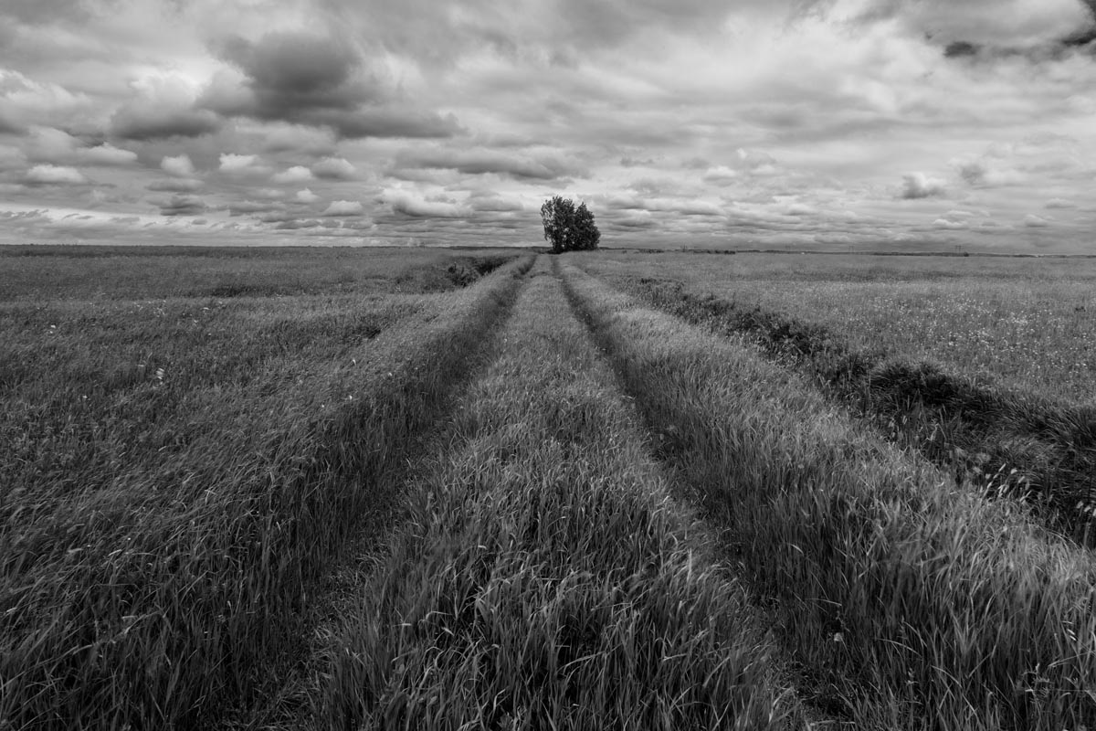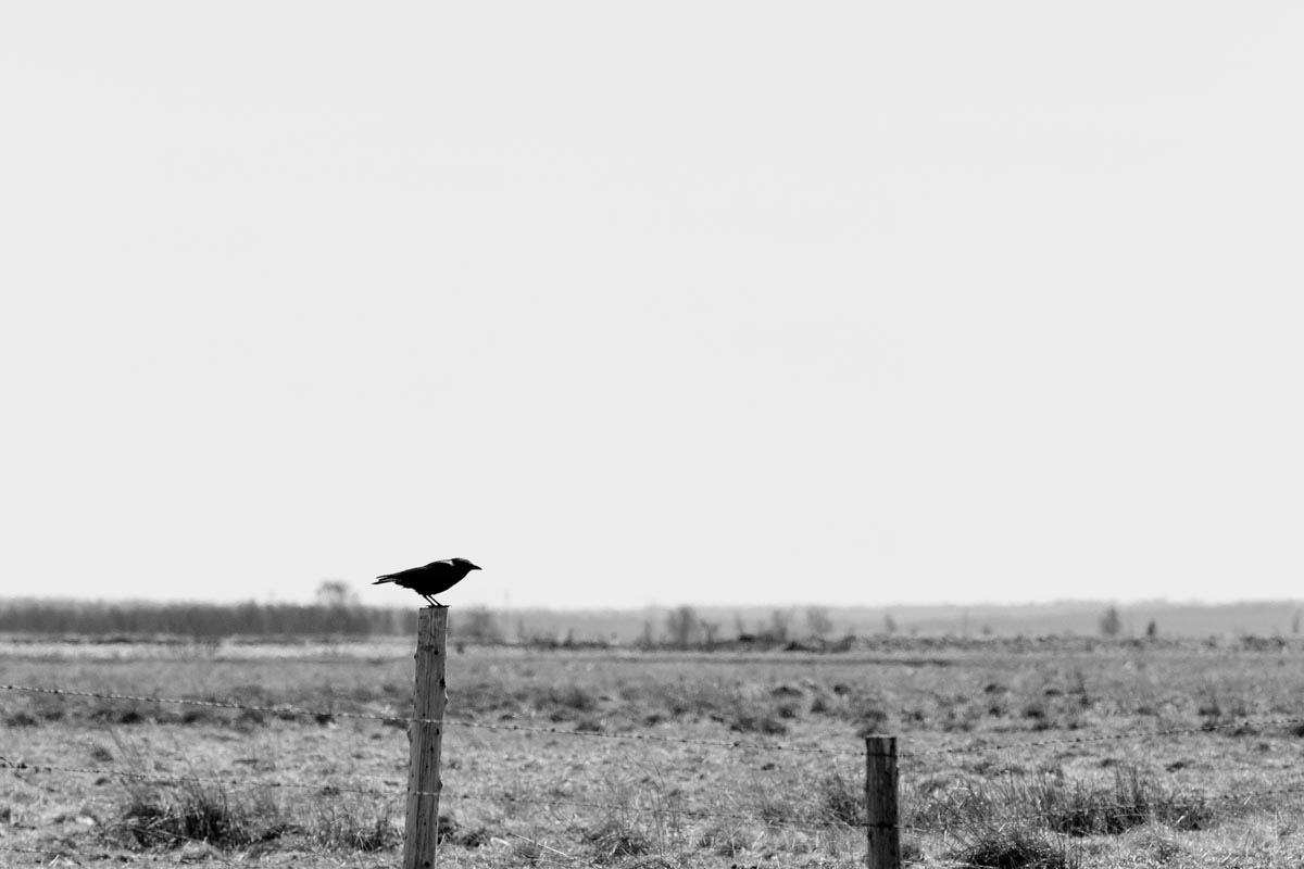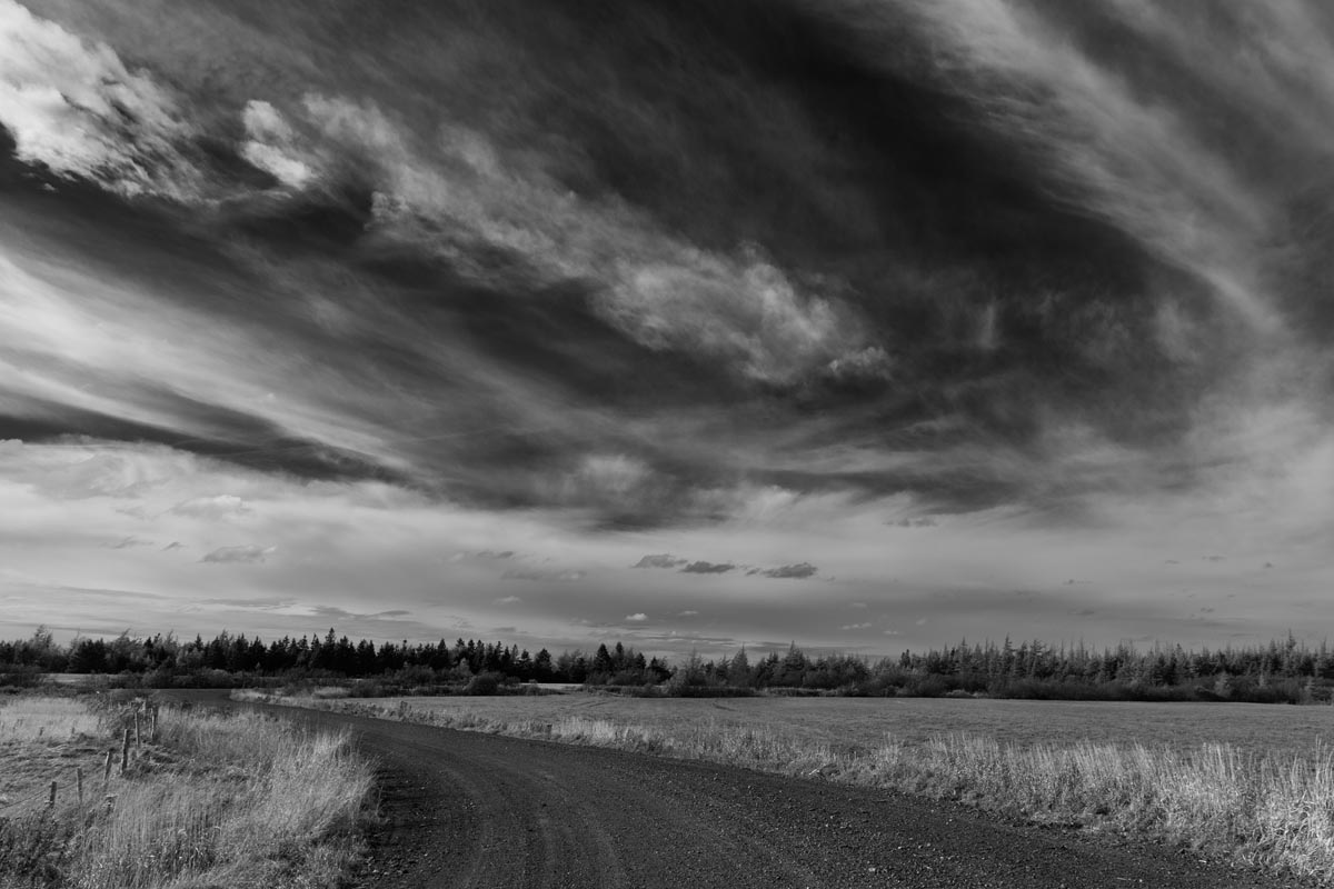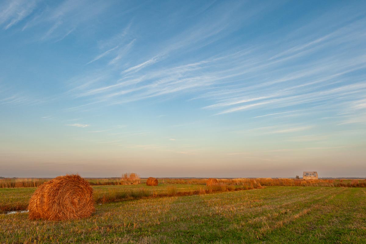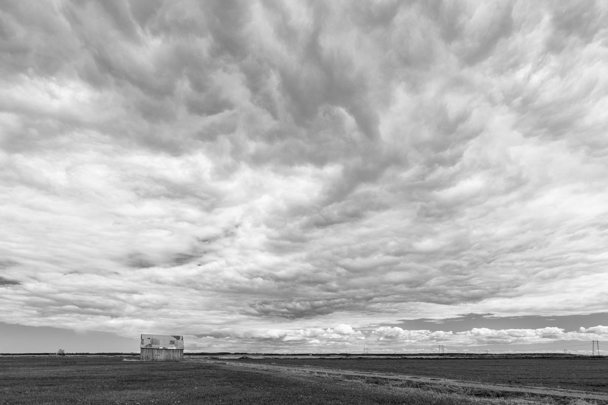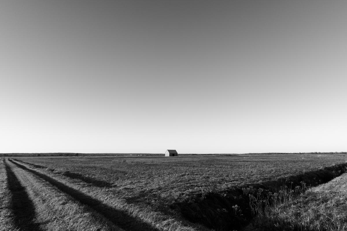 While many photographers visit for the remaining hay barns, the covered bridge, or to capture glimpses of both resident and migratory birds, my focus is usually on the land itself. I look for shapes and patterns created by the roads, tractor paths, swales, and berms, either naturally or through contrast. More often than not, I will turn my camera more to the sky, eschewing the rule-of-thirds and working with a sliver of land forming only one-fifth or one-sixth of the image. As David Plowden has stated, when there is not much to see on the land, the sky becomes the greater part of the equation. Clear skies seem to be a rarity, so the clouds are sometimes the main subject.