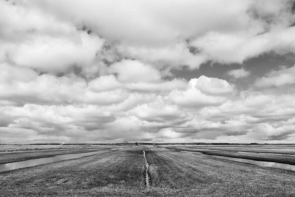 The land has been shaped into berms to keep it dry and workable. In between, swales gather the water and allow it to run off into the ditches, trenches, and, eventually, the tidal waterways forming the Tantramar River and its tributaries. It has been maintained like this for centuries, ever since the mid-1600s when the Acadian settlers built the first dikes to drain the land and permit them to cultivate the marsh hay.